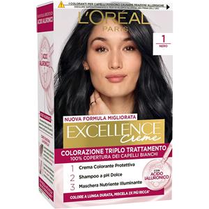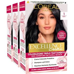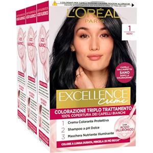 L'Oreal Paris L'Oréal Paris Tinta Permanente Excellence Creme Colore 1 Nero Colorazione Triplo Trattamento Copre 100% dei Capelli Bianchi Lunga Durata con Acido Ialuronico - 3 Tinte