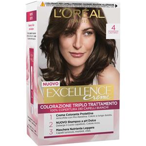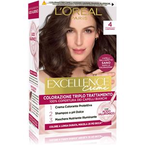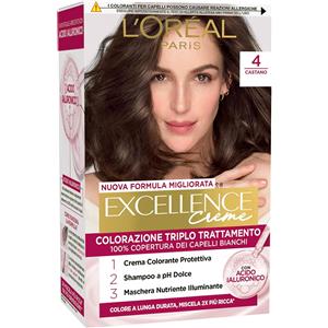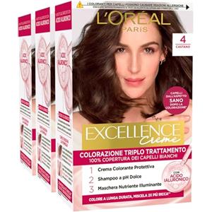 L'Oreal Paris L'Oréal Paris Tinta Permanente Excellence Creme 4 Castano Colorazione Triplo Trattamento Copre 100% dei Capelli Bianchi Lunga Durata con Acido Ialuronico - 3 Tinte