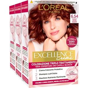 L'Oreal Paris L'Oréal Paris Tinta Permanente Excellence Creme 6.54 Biondo Scuro Mogano Ramato Colorazione Triplo Trattamento Copre 100% dei Capelli Bianchi Lunga Durata con Acido Ialuronico - 3 Tinte