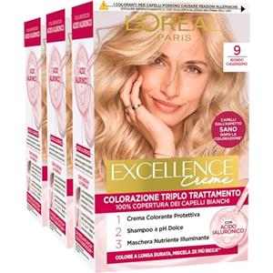 L'Oreal Paris L'Oréal Paris Tinta Permanente Excellence Creme 9 Biondo Chiarissimo Colorazione Triplo Trattamento Copre 100% dei Capelli Bianchi Lunga Durata con Acido Ialuronico - 3 Tinte