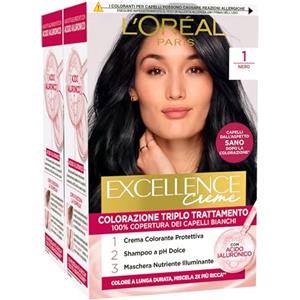 L'Oreal Paris L'Oréal Paris Tinta Permanente Excellence Creme Colore 1 Nero Colorazione Triplo Trattamento Copre 100% dei Capelli Bianchi Lunga Durata con Acido Ialuronico - 2 Tinte