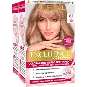L'Oreal Paris L'Oréal Paris Tinta Permanente Excellence Creme 8.1 Biondo Chiaro Cenere Colorazione Triplo Trattamento Copre 100% dei Capelli Bianchi Lunga Durata con Acido Ialuronico - 2 Tinte
