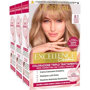 L'Oreal Paris L'Oréal Paris Tinta Permanente Excellence Creme 8.1 Biondo Chiaro Cenere Colorazione Triplo Trattamento Copre 100% dei Capelli Bianchi Lunga Durata con Acido Ialuronico - 3 Tinte