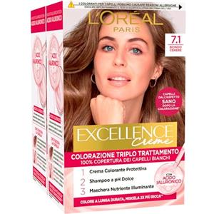 L'Oreal Paris L'Oréal Paris Tinta Permanente Excellence Creme 7.1 Biondo Cenere Colorazione Triplo Trattamento Copre 100% dei Capelli Bianchi Lunga Durata con Acido Ialuronico - 2 Tinte