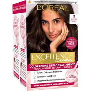 L'Oreal Paris L'Oréal Paris Tinta Permanente Excellence Creme 3 Castano Scuro Colorazione Triplo Trattamento Copre 100% dei Capelli Bianchi Lunga Durata con Acido Ialuronico - 2 Tinte