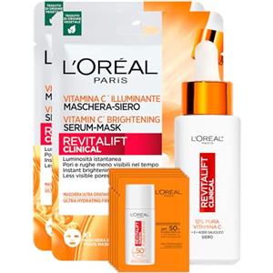 L'Oreal Paris L'Oréal Paris Revitalift Clinical Siero Viso 12% Pura Vitamina C 30ml + Maschera Siero Illuminante Vitamina C Idratante in Tessuto + Fluido Quotidiano SPF 50+ Anti-UV Bundle Routine - Set da 8
