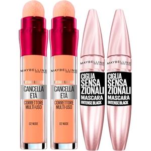 Maybelline 2x Maybelline New York Ciglia Sensazionali Mascara Volumizzante Colore Intense Black + 2x Il Cancella Età Correttore Liquido Multiuso Colore 02 Nude con Applicatore a Spugnetta