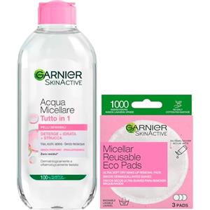 Garnier SkinActive Acqua Micellare Tutto in 1 Pelli Sensibili Struccante Senza Risciacquo 400ml + Eco Pads Dischetti Micellari Struccanti Microfibra Lavabili Riutilizzabili Confezione da 3 Dischetti