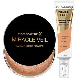 Max Factor Miracle Pure Skin-Improving Foundation Fondotinta Liquido Idratante SPF30 PA+++ Lunga Tenuta 75 Golden + Max Factor Miracle Veil Radiant Loose Powder Cipria in Polvere Translucent