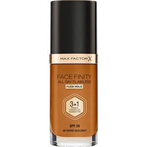 Max Factor Fondotinta Facefinity All Day Flawless 3-in-1 Vegan - Correttore, Primer e Fondotinta, Copertura Modulabile, Tenuta Fino a 30 Ore, SPF 20, W98 Warm Hazelnut, 30 ml
