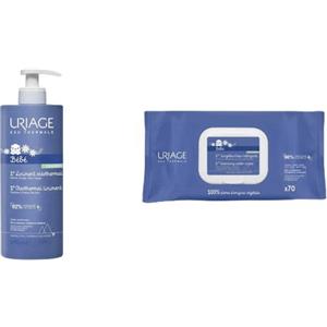 Uriage Bébé Liniment Oléo Thermal Trattamento Detergente Protettivo 500 ml + Salviette Detergenti All' Acqua Neonati e Bambini 70 Pezzi