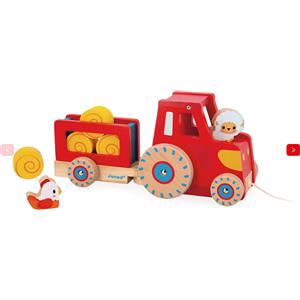 Janod Trattore da Trainare in Legno FSC con 6 Accessori - Giocattolo Multisensoriale per Bambini dai 12 Mesi