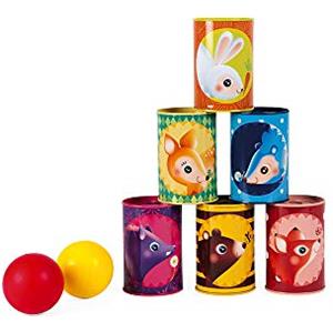 Janod Tiro al Barattolo della Foresta - Set con 6 Barattoli in Metallo e 2 Palline in Schiuma, Gioco per Bambini da 3 Anni