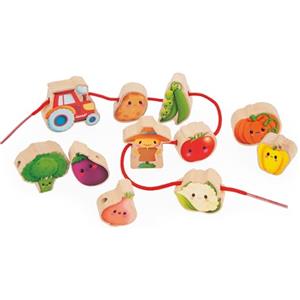 Janod - Perle da Infilare Tema Orto - Giocattolo in Legno Multisensoriale per Bambini dai 24 Mesi con 11 Perle e 2 Cordoncini