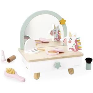 Janod Tavolino da Toilette Unicorno in Legno con Specchio e 7 Accessori per Bambini dai 3 Anni