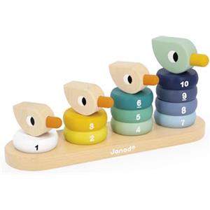 Janod Duck Family Stacker - Giocattolo educativo in legno per bambini 18-36 mesi, gioco di costruzioni con 14 pezzi, pittura ad acqua