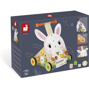 Janod Carrellino Primi Passi Coniglietto in Legno - 9 Attività, Manico Regolabile, Sistema Frenante e Ruote Silenziose