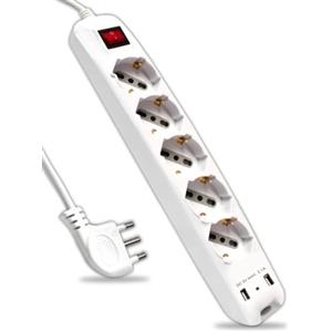 V-TAC Multipresa 5 Prese 10/16A Bipasso Shuko con 2 USB e Interruttore Luminoso, Cavo 1,5 m, Bianco
