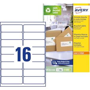 Avery Etichette in Carta Riciclata Bianco - 99,1 x 33,9 mm - 16 etichette/foglio - 100 fogli - 1600 etichette totali - Adesivo Permanente - Laser