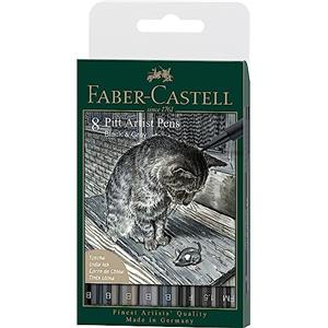 Faber-Castell 167171 Penna Pitt Artist Set di 8 Colori Nero e Grigio con Punte B, F, 1.5 e FM - Inchiostro Impermeabile e Pigmentato