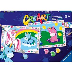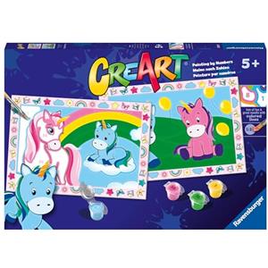 Ravensburger - creart serie junior, unicorni, kit dipingere con i numeri, contiene 2 tavole prestampate, pennello, colori, gioco creativo per maschi e femmine dai 5+ anni di età