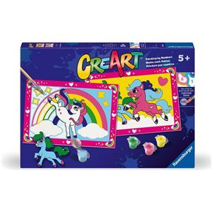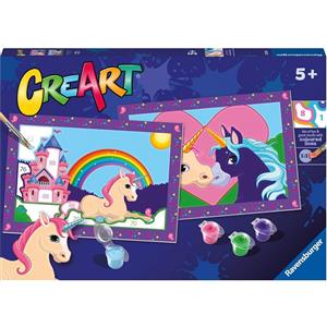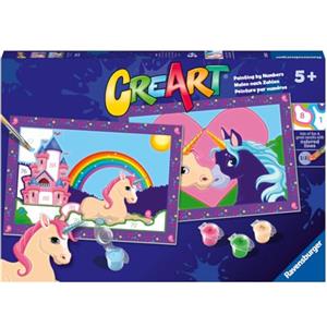 Ravensburger - creart serie junior, unicorni, kit dipingere con i numeri, contiene 2 tavole prestampate, pennello, colori, gioco creativo per maschi e femmine dai 5+ anni di età