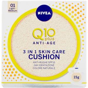 NIVEA Q10 Plus Anti-Age 3in1 Skin Care Cushion 15ml, Crema colorata viso idratante e anti-età, Crema Viso antirughe e BB cream FP15, Fondotinta cushion arricchito con Coenzima Q10, 01 Light-Medium