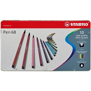 STABILO Pen 68 - Pennarello 1 mm in Scatola di Metallo da 10 Colori Assortiti - Inchiostro a Base d'Acqua, Resistente fino a 24 Ore senza Cappuccio