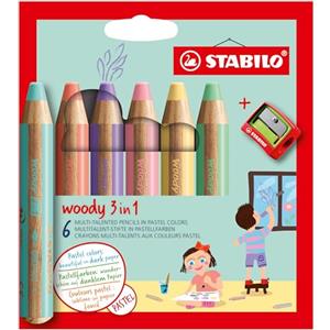 Stabilo Woody 3 in 1 - Matita colorata Multi-Funzione con Punta Larga - Astuccio da 6 Colori Pastello Assortiti - Include Temperino
