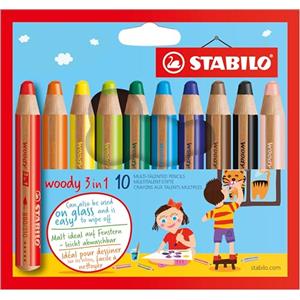 STABILO Woody 3 in 1 - Matita colorata Multi-Funzione, Astuccio da 10 pz, Mina XXL (10 mm), Lavabile