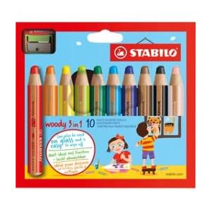STABILO Woody 3 in 1 - Matita Colorata Multi-Funzione con Temperino - Astuccio da 10 Colori Assortiti - Mina XXL da 10 mm