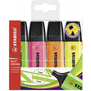 STABILO BOSS ORIGINAL Evidenziatore 4 pz Punta a Scalpello 2-5 mm Colori Assortiti con Tecnologia Anti-Dry-Out