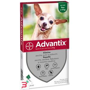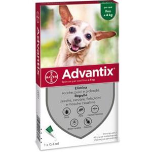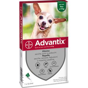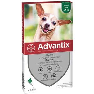 Advantix® Spot-On Antiparassitario per Cani Fino a 4 kg - 1 Pipetta da 0,4 ml, Elimina Zecche, Pulci e Pidocchi, Protegge da Zanzare e Rischio di Leishmaniosi