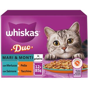 Whiskas Duo Mari e Monti - Alimento Umido Completo per Gatti Adulti in Gelatina, 12x85g