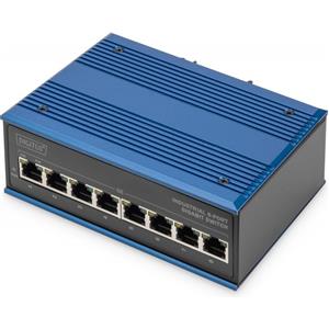 Digitus DN-651121 Switch PoE Gigabit Ethernet Industriale a 8 Porte RJ45, Non Gestito, Alloggiamento Metallico, Nero e Blu