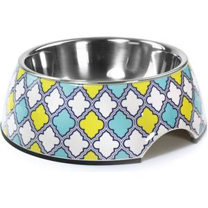Record Ciotola per Cani in Melamina e Acciaio Inox - Ø 17,5 cm, Capacità 350 ml, Design Geometrico Multicolore con Gommini Antiscivolo