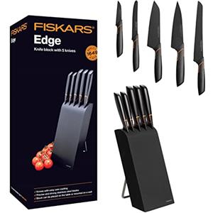 Fiskars Ceppo di design con 5 coltelli in acciaio inossidabile, legno di betulla, nero, 15,5 cm x 37 cm