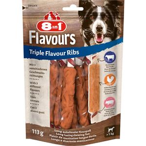 8in1 Triple Flavour Ribs - Snack per Cani a Triplo Sapore (Pelle di Maiale, Pelle di Manzo, Petto di Pollo) - Costolette Masticabili da 113 g (6 pz)