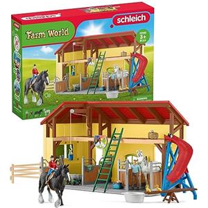 schleich FARM WORLD | Scuderia 42485 | Set con scuderia, 2 cavalli, 5 altri animali, 2 contadini, scivolo, altalena & accessori | Idea regalo bambini | Giocattolo fattoria dai 3 anni | 82 pezzi