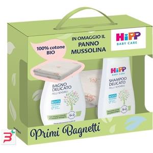 HIPP ITALIA SRL HIPP COFANETTO PRIMI BAGNETTI MUSSOLINA 1 BABY CARE BAGNO DELICATO 350 ML + 1 BABY CARE SHAMPOO DELICATO 200 ML + 1 PANNO MUSSOLINA