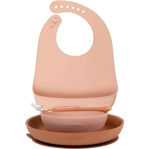 Nattou Set di Stoviglie in Silicone per Bambini - 4 Pezzi con Piatto, Scodella, Cucchiaio e Bavaglino Rosa/Marrone, Senza BPA
