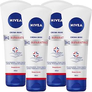 Nivea Crema Mani Riparatrice 3in1 Formula Nutriente Vellutante 24h con Dexpantenolo per Sollievo Immediato e Protezione a Lunga Durata su Pelle Secca Arrossata Screpolata - 4 Flaconi da 100ml