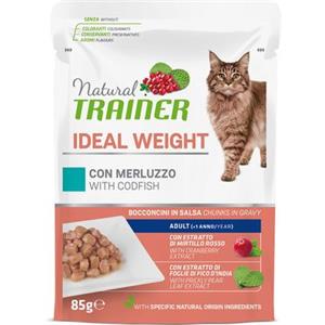 Trainer Natural Gatto Umido Ideal Weight Merluzzo 85g - Alimento Completo per Gatti Adulti con Ridotto Contenuto di Grassi