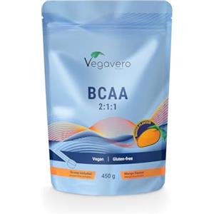 Vegavero BCAA in Polvere 450 g - 2:1:1 con L-leucina, L-isoleucina e L-valina, Gusto Mango, Senza Additivi, Vegan