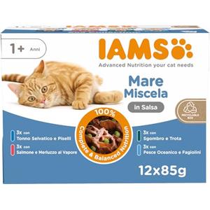 IAMS Delights Adult Sea Collection - Cibo umido in salsa per gatti, 12 x 85g con salmone, tonno, sgombro e pesce di mare