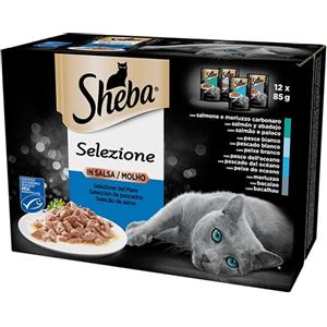 Sheba Selezione del Mare in Salsa - Alimento Umido per Gatti Adulti, 12 Bustine da 85g con Salmone e Merluzzo