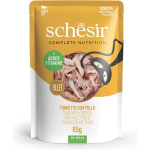 Schesir Filetti in Gelatina per Gatti Adulti - Tonnetto e Pollo - 12x85g, Alimento Umido Completo con Ingredienti Naturali