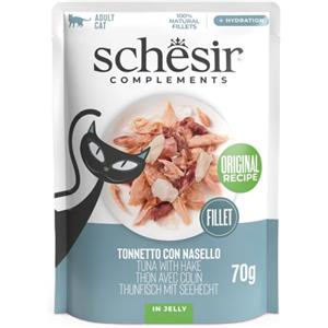 Schesir Filetti di Tonno con Nasello in Gelatina - Cibo Umido Complementare per Gatti Adulti - 12 Buste da 70g