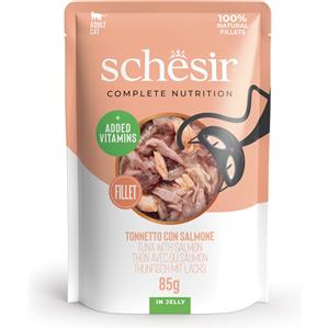 Schesir Alimento Umido Completo per Gatti - Tonnetto con Salmone in Gelatina - 12 x 85g - Ingredienti 100% Naturali e Cruelty Free