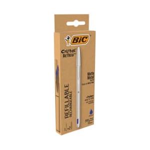 BIC Cristal Re'New - Penna a Sfera Ricaricabile Blu 1mm, Fusto in Metallo, Cappuccio in Plastica Riciclata, Confezione con 2 Ricariche